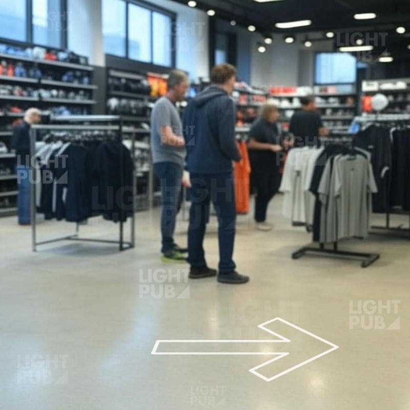 The floor-mounted lighted arrow projector is designed to attract attention and improve traffic flow in your points of sale. It fits perfectly into a modern merchandising strategy, guiding your customers to key areas: new products, special offers, best-sellers or seasonal departments.